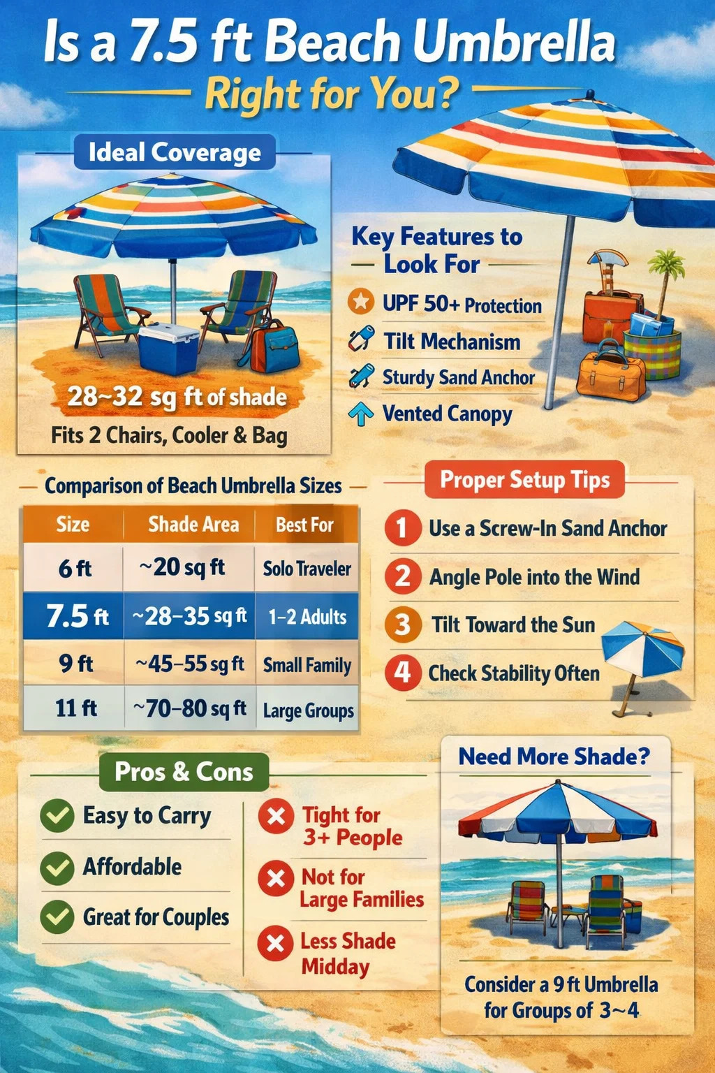 Die kurze Antwort: Ein 7,5-Fuß-Strandschirm ist aus gutem Grund die beliebteste Größe auf dem Markt – Es umfasst etwa 28 bis 32 Quadratfuß schattigen Bereich, der für zwei Strandkörbe, eine Kühlbox und eine Tasche ausreicht, ohne dass jemand im direkten Sonnenlicht sitzt. Wenn Sie alleine oder zu zweit einkaufen, ist ein 7,5 Fuß langes Vordach genau das Richtige zwischen Tragbarkeit und praktischer Abdeckung. Für Gruppen von drei oder mehr Personen sollten Sie sich vielleicht nach 9-Fuß-Optionen umsehen, aber für die meisten Strandausflüge sind 7,5 Fuß die erste Wahl.
