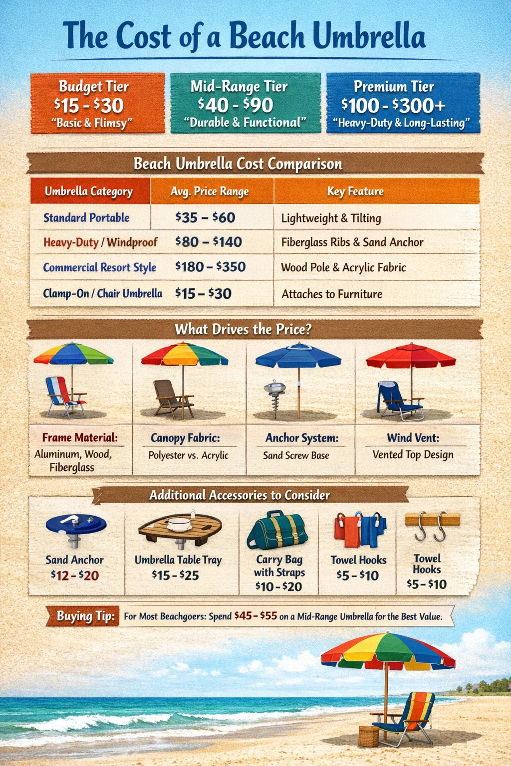 Für den Gelegenheitsreisenden, der zweimal im Jahr an den Strand geht und Geld ausgibt 45 bis 55 $ auf einer Mittelklasse Sonnenschirm am Strand ist der „Sweet Spot“. Es bietet genug Haltbarkeit, um den typischen Meeresbrisen standzuhalten, ohne Ihr Budget zu sprengen. Wenn Sie in der Nähe des Ozeans wohnen und wöchentliche Besuche planen, sollten Sie investieren 120 $ oder mehr In einem Hochleistungsmodell mit Glasfaserrippen sparen Sie auf lange Sicht Geld und Frust.