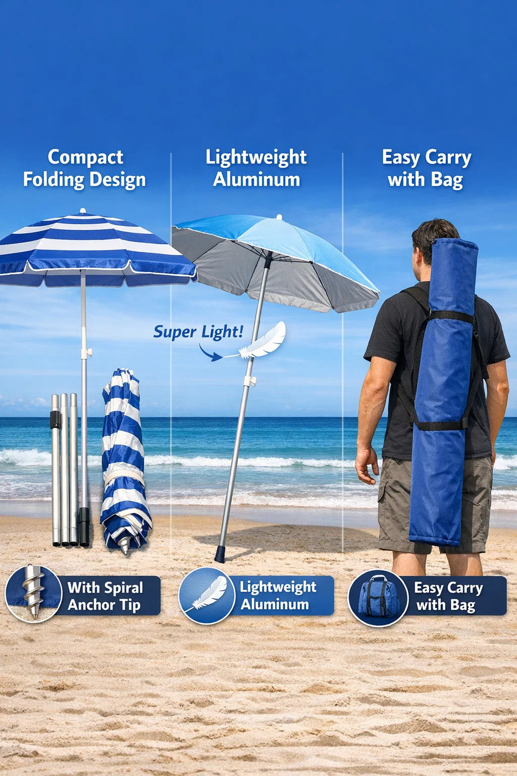 Um Platz zu sparen, kaufen Sie am besten einen Strandschirm mit einem „Spiralbohrer“-Kopf an der Unterseite der Stange, sodass Sie keinen besonders sperrigen Kunststoffsockel oder separaten Sandanker mit sich herumtragen müssen.