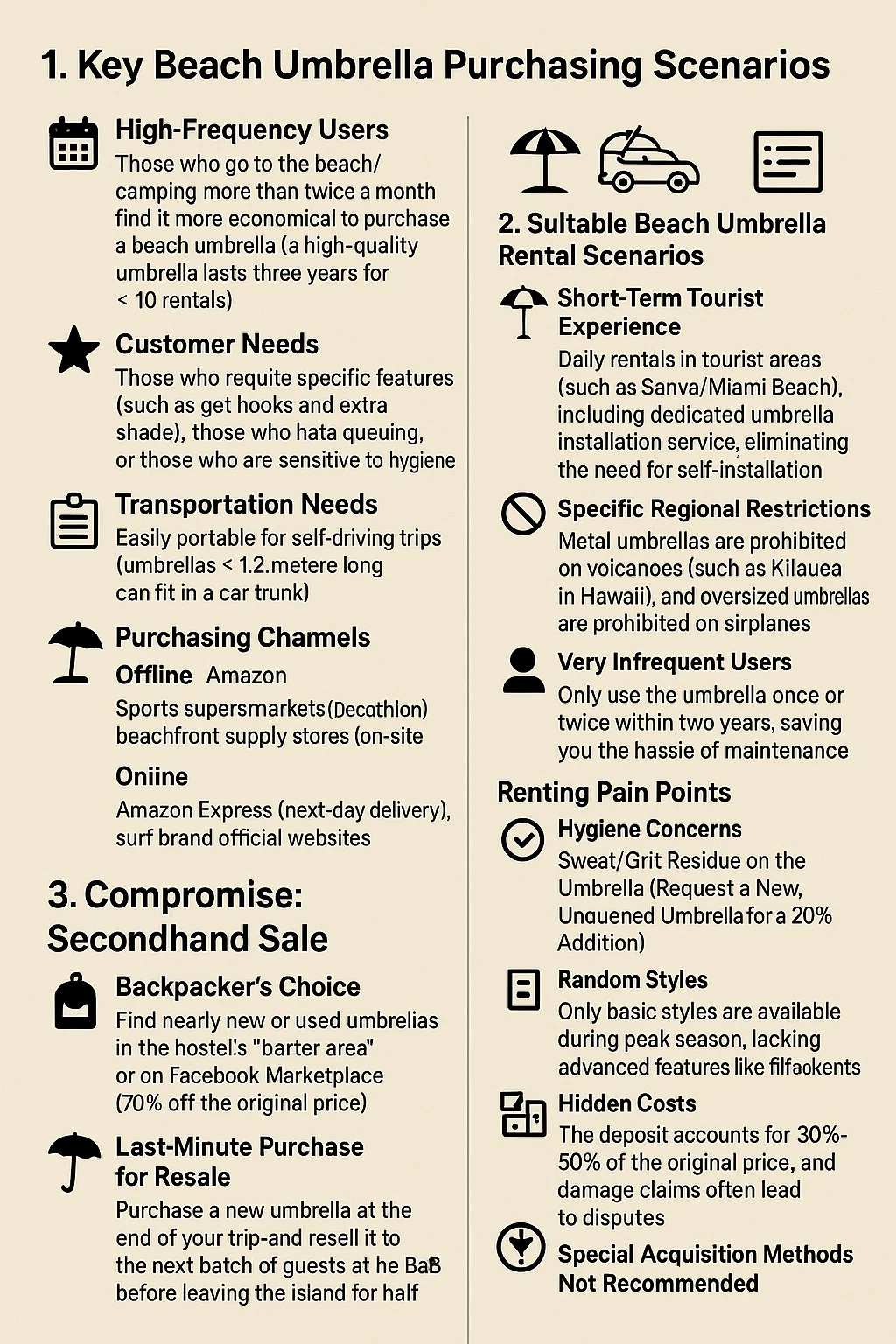 Hochfrequente Benutzer: Diejenigen, die mehr als zweimal im Monat zum Strand/Camping gehen, finden es wirtschaftlicher, einen Regenschirm zu kaufen (ein hochwertiger Regenschirm dauert drei Jahre für 10 Mieten).
