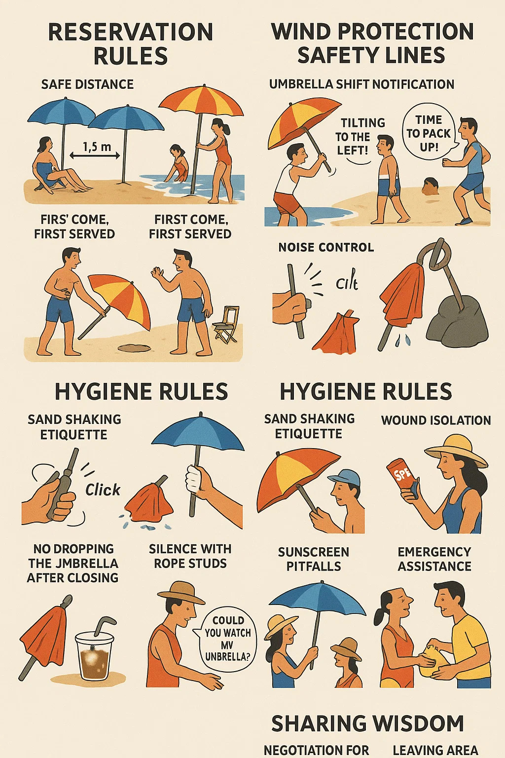 Sandschüttel-Etikette: Bevor Sie Ihren Regenschirm schließen, schütteln Sie ihn dreimal an einem abgelegenen Ort, um zu verhindern, dass Sand in die Sandwiches anderer Leute gelangt.