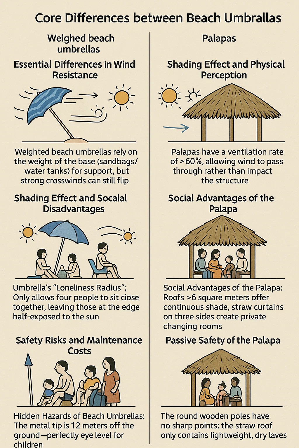 Einschränkungen beim Sonnenschirm-Sonnenschutz: Der Schatten unter dem Sonnenschirm verschiebt sich mit dem Winkel der Sonne und erfordert häufige Anpassungen. Die Silberbeschichtung reflektiert die Wärmestrahlung des Bodens nur unzureichend, sodass die Temperatur unter dem Regenschirm selbst mittags, wenn die Sandoberfläche 60 °C hat, immer noch über 40 °C liegen kann. Palapas bieten natürliche Kühlung: Verdickte Palmwedel absorbieren Wärme, anstatt sie zu reflektieren, und sorgen so für eine konstante Luftfeuchtigkeit (am Strand gemessen, 3-5 °C niedriger als unter dem Sonnenschirm); Der vollständige Sonnenschutz erfordert keine Anpassung.